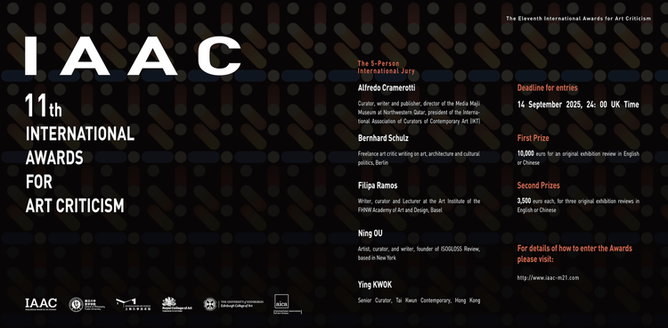 The Eleventh Edition of the International Awards for Art Criticism (IAAC 11) 2025, is open to candidates from anywhere in the world writing in Chinese or English about any contemporary art exhibition held anywhere in the world or on-line in 1 September 2024 and 31 August 2025.